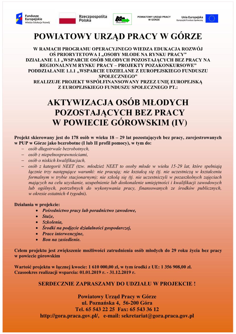 Nabór wniosków na aktywne formy w ramach projektu pn. „Aktywizacja osób młodych pozostających bez pracy w powiecie górowskim (IV)" współfinansowanego przez Unię Europejską ze środków Europejskiego Funduszu Społecznego, w ramach Programu Operacyjnego Wiedza Edukacja Rozwój, Poddziałanie 1.1.1 Wsparcie udzielane z Europejskiego Funduszu Społecznego