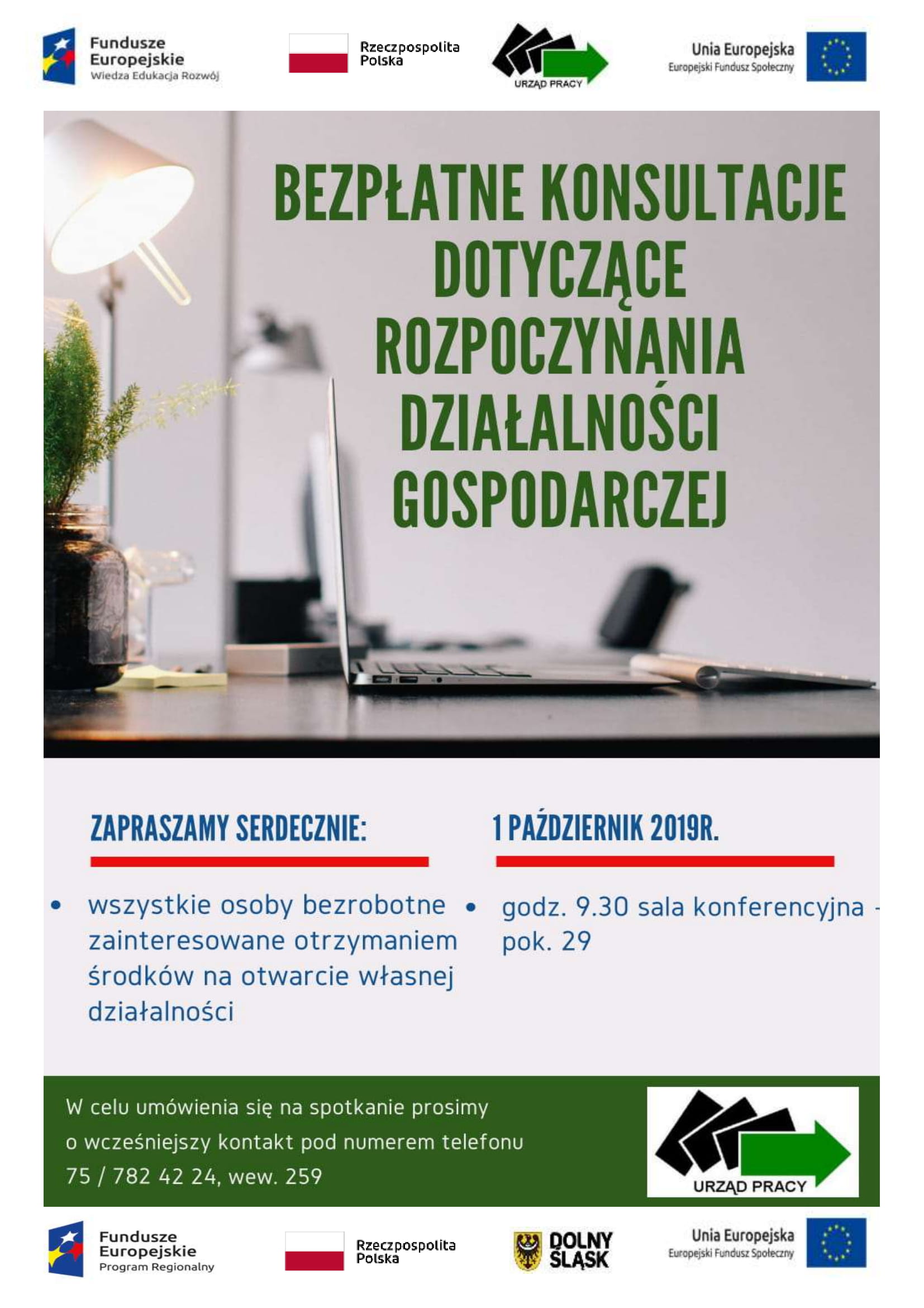 Powiatowy Urząd Pracy w Lwówku Śląskim zaprasza wszystkie osoby bezrobotne, zainteresowane otrzymaniem dotacji na rozpoczęcie działalności gospodarczej w dniu 1 października 2019r. o godz. 9.30 do sali konferencyjnej (pok.29) na bezpłatne konsultacje dotyczące rozpoczynania działalności gospodarczej.