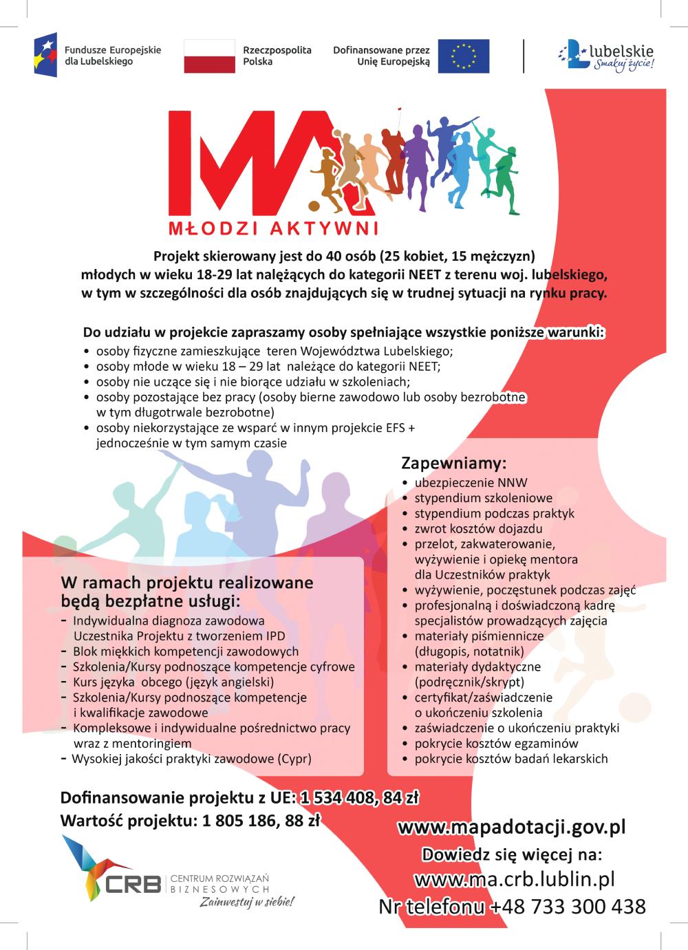 W związku z trwającą rekrutacją do projektu pn. „Młodzi - Aktywni” nr projektu: FELU.09.02-IP.02-0009/23 Priorytetu IX Zaspokajanie potrzeb rynku pracy, Działania 9.2 Aktywizacja zawodowa Programu Fundusze Europejskie dla Lubelskiego 2021-2027 przekazujemy Państwu informację na temat powyższego projektu.